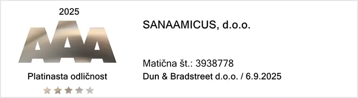 Podjetje SanaAmicus d. o. o. izpolnjuje kriterije zlate bonitetne odličnosti za leta 2020, 2021, 2022 in 2023 in spada med najbolj zanesljive slovenske poslovne subjekte, ki so upravičeni do uporabe statusa Platinasta odličnost kot simbola ocene bonitetne odličnosti.